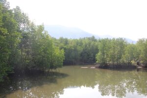 Dan het mangrovenbos. Hier was het ons om te doen. Men had een loopbrug door het bos aangelegd zodat je er rustig kunt wandelen. Hier was het erg rustig en konden we af en toe een vogel of ander beestje zien.