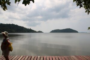 Daarna nog een stuk van het mangrovenbos, dit keer met een rode loopbrug. Hier was het veel drukker, kennelijk werd deze echt veel aangedaan door toeristen. We kregen dan ook weinig wild te zien. Hier waren wel veel meer soorten mangrove te zien en – gek genoeg – ook palmen die waren ontstaan doordat een aangespoelde kokosnoot was ontsprongen.
