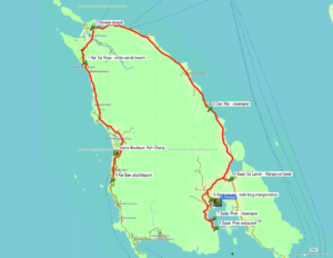 Als laatste excursie voor deze vakantie hadden we een taxi afgehuurd die ons het eiland rond zou rijden langs bezienswaardigheden. Zoals je op het kaartje kunt zien werd het niet echt een rondje: onderaan is een natuurreservaat en daar loopt geen weg door.