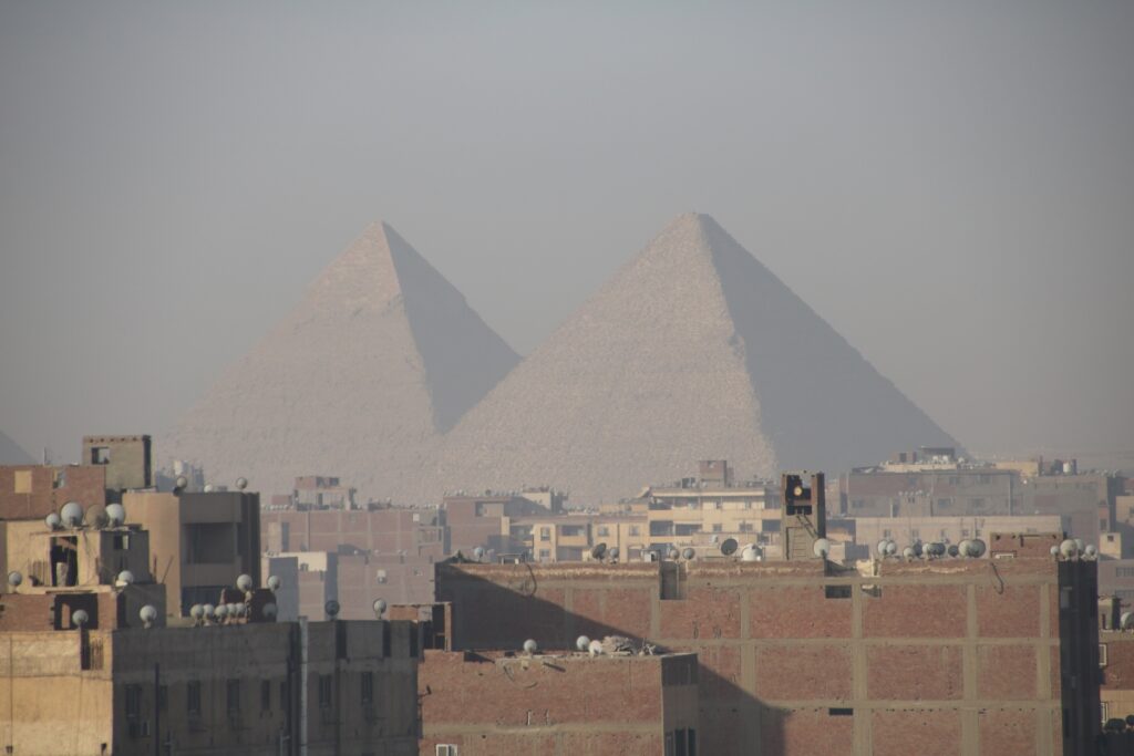 De volgende ochtend stond de bus al klaar om ons naar Alexandrië te brengen. Gelukkig was er na het ontbijt nog wel even tijd om naar de bovenste verdieping van het hotel te gaan. Daar was een café/restaurant van waaruit we over de stad konden kijken. En ja hoor, in de verte waren de piramides van Gizeh goed te zien (zie foto hierboven).