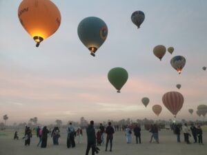 Nadat deze lichting ballonnen uit de weg was werden de volgende balonnen, waaronder die van ons klaargemaakt. Op zeker moment werden we uitgenodigd om in te stappen en kort daarna vertrokken we. In het begin hadden we veel last van het stof dat hier opgewekt werd maar na verloop van tijd werd het zicht beter.