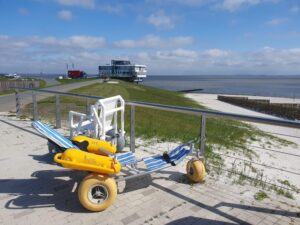 Als eerste komen we langs de mond van de Eems, want daar ligt Delfzijl eigenlijk aan, en verrassend genoeg heeft men daar een zandstrandje weten te creëren. Het waaide flink en dus stoof het zand alle kanten op: er was dan ook niemand te zien op het strand. Maar met minder wind zal het er best wel druk zijn.