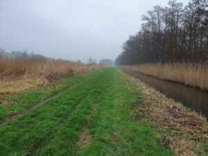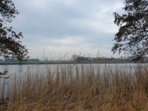 Na een goed uur maakt het pad een scherpe bocht en vanaf hier loop ik langs met Naardermeer, een gigantisch natuurgebied.