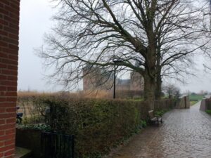 Een kwartiertje later was de regen grotendeels overgetrokken en werd het tijd om het pad verder te volgen. Dan volgt vrij snel een hoogtepunt van de wandeling: het Muiderslot. Toch ben ik daar niet op bezoek gegaan, dat doe ik nog wel een andere keer. De dame achter de kassa liet me even door om een passende foto te maken. Het ziet er nu wat triest uit maar ja, het is nog geen zomer en het had net geregend …