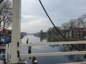 De wandeling begon waar ik vorige keer geëindigd was: in Weesp aan de Vecht. DIt keer waren de weersvoorspellingen duidelijk minder positief, maar omdat alleen buien werden voorspeld dorst ik het wel aan. Terwijl ik in Leiden in het station wachtte op de trein kwam er net zo’n bui voorbij. Op zich prima, zolang het daarna maar weer droog is. En dat was in Weesp op deze brug tegenover Fort Ossenmarkt ook het geval.
