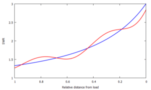 Figuur 1: SWR als functie van afstand tot de belasting (in golflengten). Blauwe lijn: effect van demping voedingskabel. Rode lijn: demping samen met afwijking karakteristieke impedantie voedingskabel. De kabeldemping en -impedantie zijn opzettelijk wat groter gekozen om het effect goed te demonstreren.