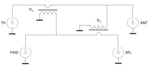 Figuur 2: Sontheimerbrug die het signaal van een transceiver (TX) naar de antenne (ANT) splitst in een voorwaarts (FWD) en een gereflecteerd signaal (RFL).