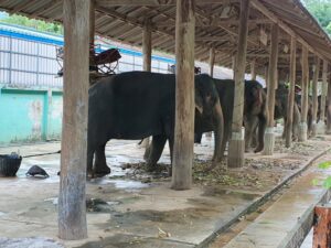 Afgezien van winkeltjes, restaurantjes, hotels en gewoon woningen kwamen we toen ook langs een olifantenstal. Hierop kun je over het eiland gaan. Ze zaten aan twee poten vastgebonden en leken het niet naar hun zin te hebben.