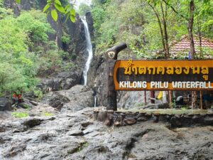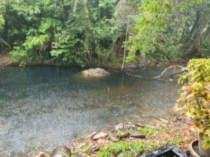 Zondag klonk er wel onweer in de omgeving maar bleef het droog. Dat was niet zo vanmorgen. Tijdens het ontbijt kwam al een forse tropische bui naar beneden. Na zo’n anderhalf uur was die uitgeraasd en was het praktisch droog. We besloten te gaan wandelen naar de dichtstbijzijnde waterval.