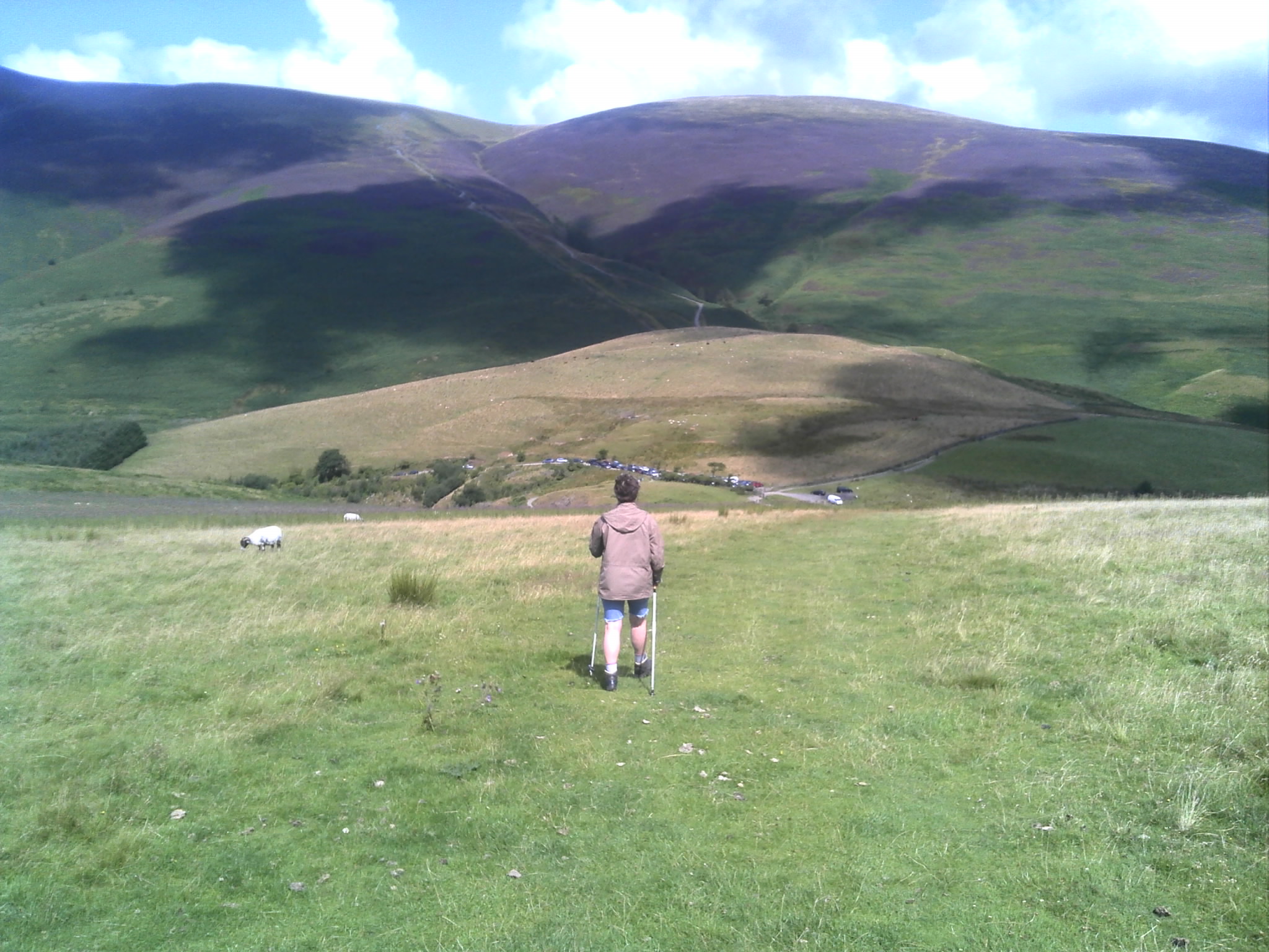 Vervolgens op weg voor wat meer inspanning. De auto was eerst aan de beurt, want het begin van de wandeling was vanaf een parkeerkplaats- als je het zo mag noemen – aan het einde van een steil, kronkelig weggetje waarlangs al allerlei auto’s geparkeerd stonden. De wandeling zou leiden naar de Latrigg die met zijn 112 meter nog niet eens zo hoog is.