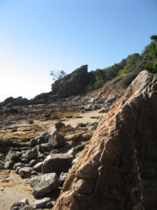 Natuurlijk moesten we dat Keppel Sands nader bestuderen. Aan de campingzijde was uitzicht op een baai maar de mooiere met strand lag aan de andere kant. Het zand is inderdaad veel fijner dan wat we elders tegenkwamen, bijna poederachtig. Aan beide uiteinden zou een schat verstopt liggen, maar de ene kant was ontoegankelijk door constructiewerkzaamheden. Dan maar de andere kant. Dat was minder eenvoudig dan gedacht: het strand eindigde in rotsen en langs de rots moest er omhooggeklommen worden naar de verstopplaats. Maar uiteindelijk is het gelukt.
