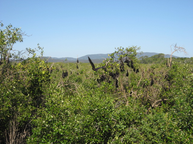 In het stadje kwamen we langs struiken waar vrij grote vleermuis-achtigen in hingen. Toen we er op af liepen begonnen ze onrustig te worden en sommigen vlogen weg. Een bijzonder gezicht.