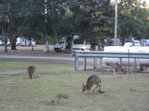 Ook liepen de kangoeroes tegen de vooravond uitgebreid over de camping te scharrelen naar voedsel. Helemaal tam zijn ze niet want als kinderen op ze jagen raken ze al snel geïrriteerd en springen alle kanten op.